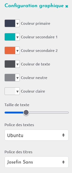Le bouton Créer une nouvelle configuration graphique permet d'accéder au choix de couleurs et polices. Cette configuration graphique, aussi appelée preset, pourra être appliquée à l'ensemble du site ou à une page individuellement.